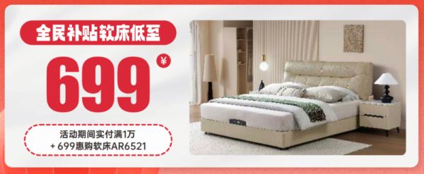 活动期间,只要您实付金额满1万元,即可以“惠购价699元”将优质软床 AR6521 带回家!这不仅是补贴,更是我们送给您的新年礼物。