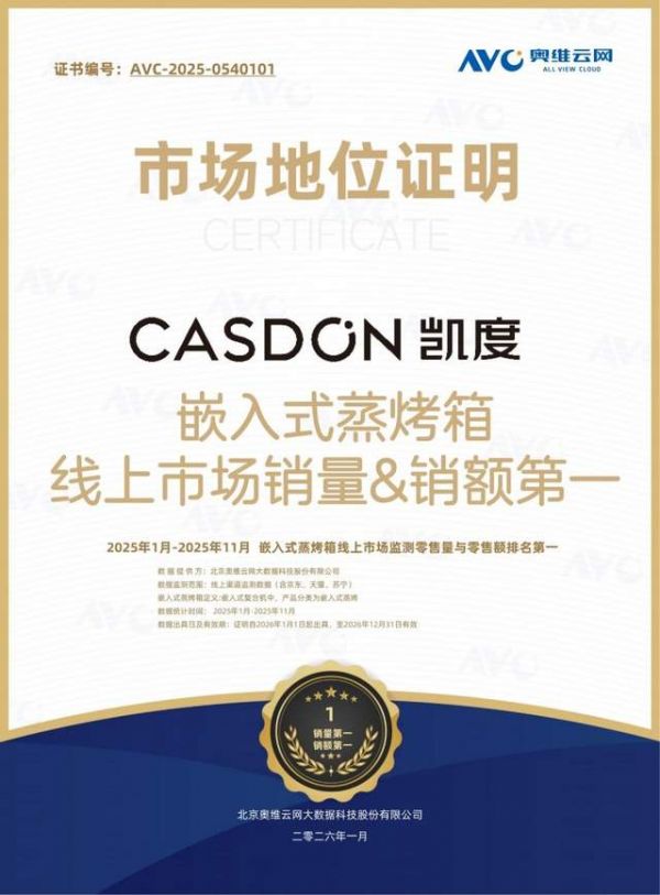 ZR PRO 2微蒸烤一体机的亮眼表现,离不开品牌的深厚积淀。作为中国高端新厨电专家,凯度围绕用户需求持续研发,累计拥有超200项国家核心技术专利,产品覆盖蒸烤箱、净饮机等多个品类,曾斩获德国红点、德国iF、美国IDEA等权威奖项。奥维云网数据显示,2025年1-11月,凯度摘得嵌入式蒸烤箱线上市场销量与销额第一,充分体现了消费者对品牌及产品的高度认可。深厚的品牌积淀与卓越的市场成绩,共同为产品力提供坚实支撑。
